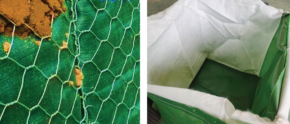 增強(qiáng)土工袋是以高強(qiáng)度、抗老化、耐酸堿性強(qiáng)的PET(或PP)編織袋作為外層加強(qiáng)結(jié)構(gòu),再復(fù)合濾水土工布,形成一種高強(qiáng)度抵抗水流沖蝕、抗浪淘刷且適應(yīng)一定量變形,同時能夠具有一定的保土濾水能力的結(jié)構(gòu)體。為了進(jìn)一步加強(qiáng)增強(qiáng)土工袋的保土能力,袋身與頂蓋的密封分兩層進(jìn)行:內(nèi)層采用縫紉的方法形成封閉,外層PET編織布袋身與上蓋用高強(qiáng)度鏈接繩或高鍍鋅絲連接。雙層縫合增強(qiáng)袋內(nèi)土體的穩(wěn)定性,保持袋體的形狀具有抗變形,防坍塌的功能。